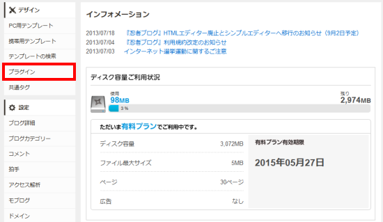 忍者ブログ管理画面のプラグインをクリック