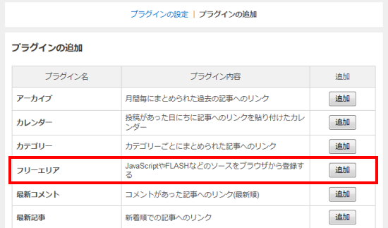 フリーエリアの追加ボタンをクリック